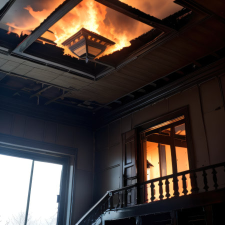 AI Generated. Flames engulf a room as a fire rages outside a large window in the evening light