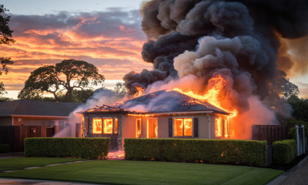 Suburban home engulfed in raging fire, massive flames bursting from windows and roof, heavy black smoke billowing into dramatic sunset sky.