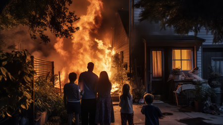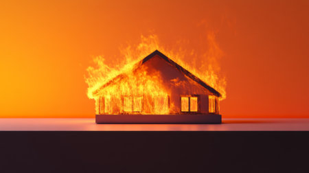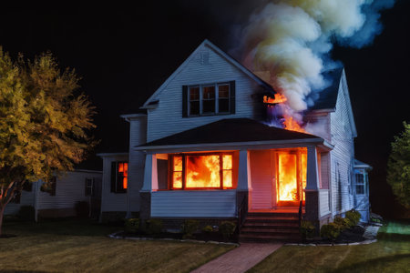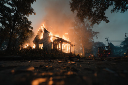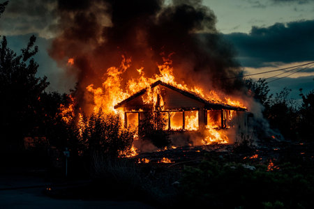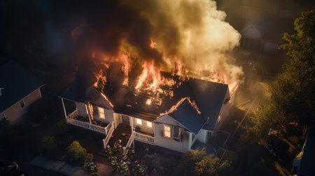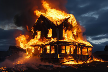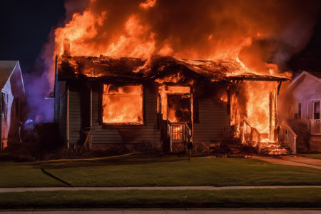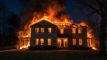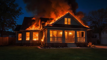 Intense fire engulfs suburban home at twilight casting orange glow. Dramatic scene illustrating disaster emergency services destruction.
