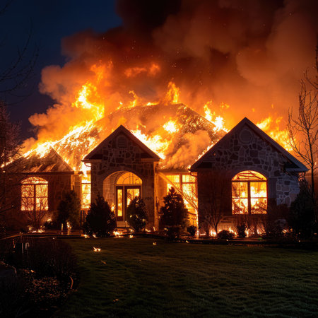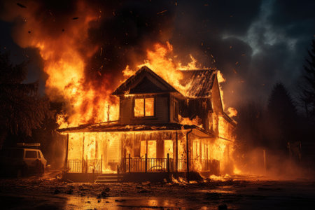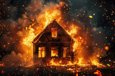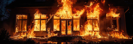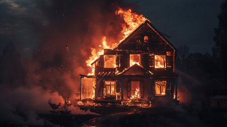 house fully engulfed in intense flames, with smoke and embers filling the night sky