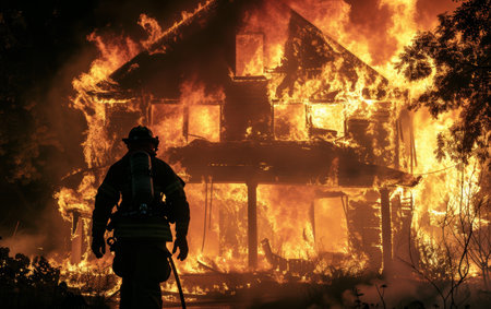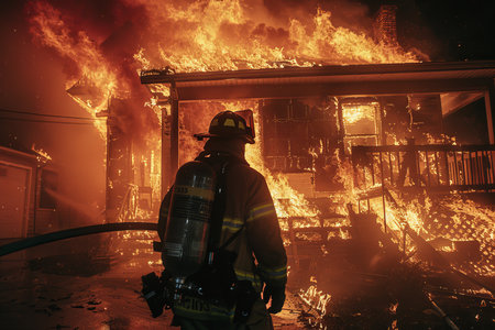 Firefighter approaching a fully engulfed home at night. Heroic firefighter ready to tackle a catastrophic residential fire. Concept of bravery, emergency action, peril, and firefighting.