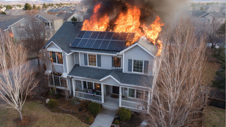 Flames consume a house rooftop while smoke rises alarming neighbors in the peaceful neighborhood.