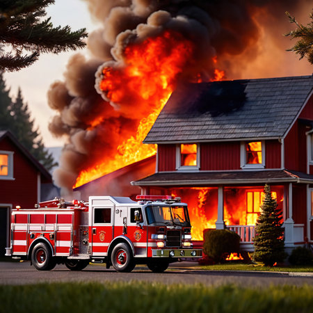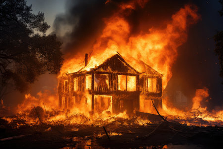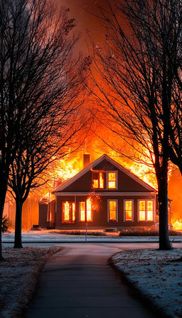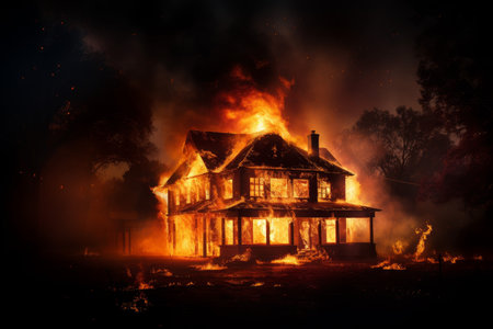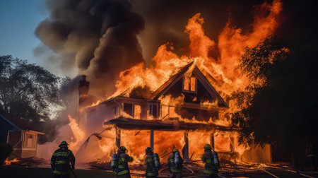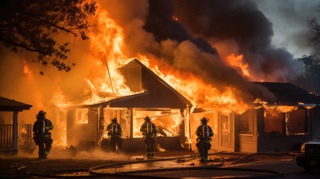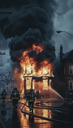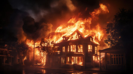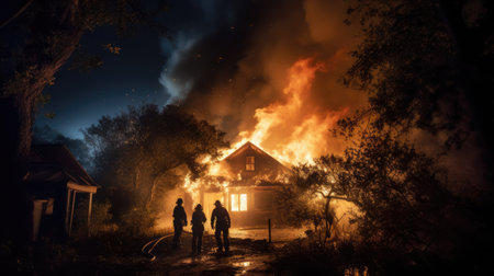 A vivid night scene depicts a large house engulfed in flames. Firefighters are actively working to extinguish the fire, using hoses to douse the intense blaze. The house is surrounded by tall trees, and the fire's glow illuminates the dark sky. The scene captures the urgency and danger of the situation, highlighting the bravery of the firefighters.