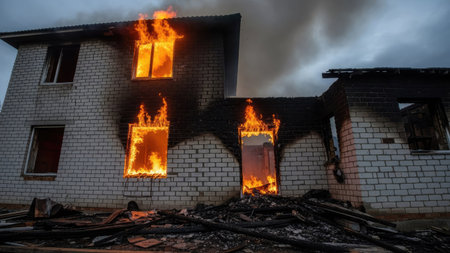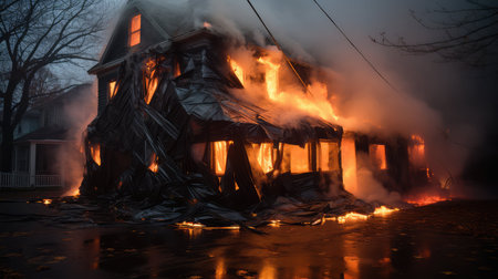 Destructive House in fire. Damage smoke rescue. Generate Ai