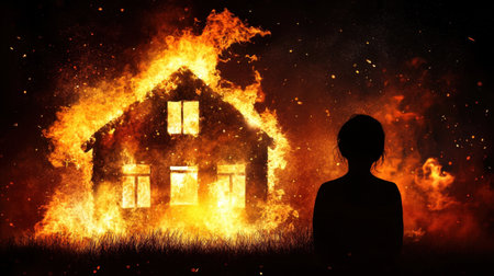 Silhouette of a person with emotionless eyes, watching their house go up in flames, bright fire illuminating the night. Copy space for text.