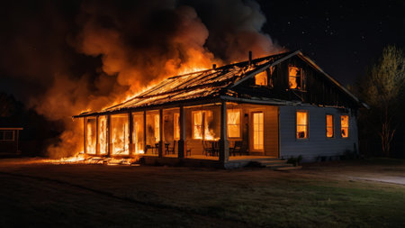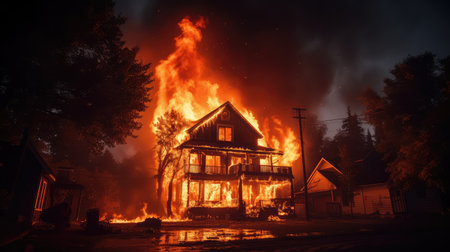 Inferno A Devastating House Fire Under the Night Sky, Flames Engulfing the Entire Dwelling, Tragedy