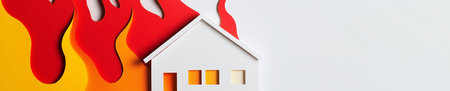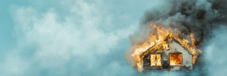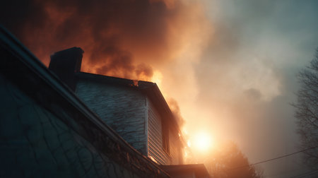 Residential house roof engulfed in orange flames with thick smoke rising. Dramatic scene represents disaster, danger, and emergency. Ideal for news reports, insurance, fire safety concepts.
