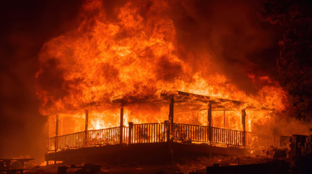 A dramatic scene depicting a wooden structure engulfed in intense flames, showcasing the vivid contrast of bright orange and red against the night sky.