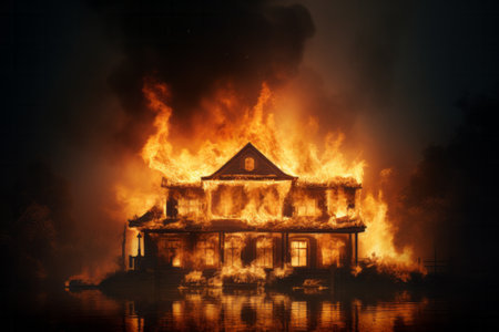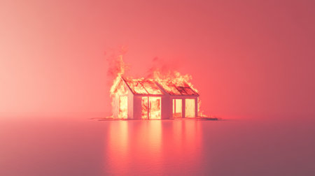 Burning house in surreal landscape with reflective water surface, concept of destruction, AI Generated