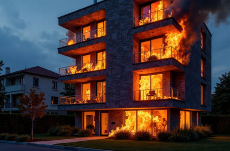 fire in the apartment. flames engulf an apartment in a multi-story building. AI Generative