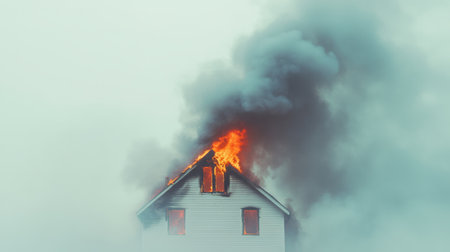 Large flames and billowing smoke rising from the roof of a burning residential house during a foggy day, creating a dramatic and devastating scene