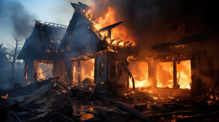 Inferno consumes an old wooden house, fiery glow visible through windows, charred remains of the roof against a smoky sky. Devastating blaze of a derelict building