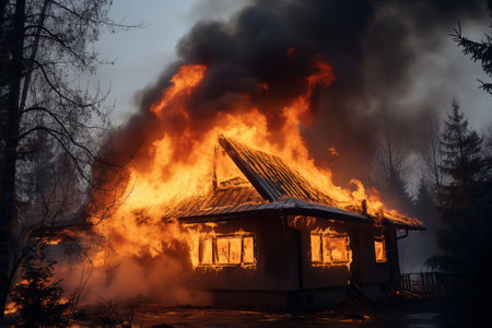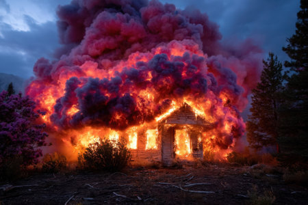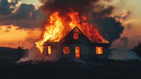 A rural house is engulfed in flames, with thick smoke billowing into the evening sky. The fire illuminates the surrounding area as firefighters battle the blaze, creating a dramatic spectacle.