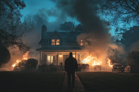 A solitary man is silhouetted against a blazing house fire, showcasing the fierce power of the flames illuminating the darkness in a haunting scene that evokes strong emotions and a sense of crisis