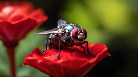 A macro shot of a fly on a red flower, showcasing the intricate details of the insect and the vibrant color of the flower in a natural setting
