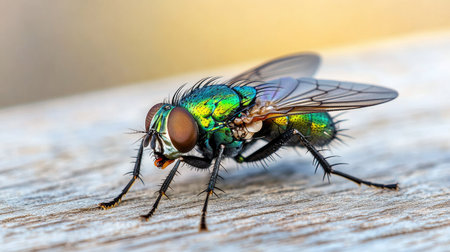 Macro close-up of a fly showing wings, fine hairs and iridescent shimmer on a blurred background. Generative AI.