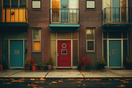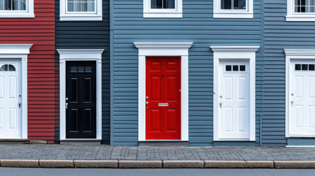A single bright red door on a street of identical houses with plain white doors, showcasing bold uniqueness