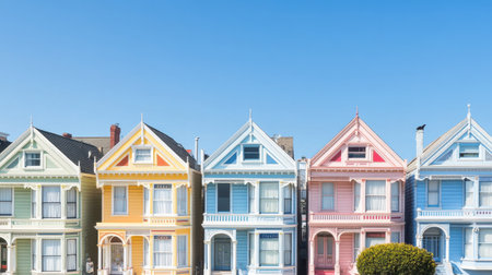 Vibrant row of colorful Victorian houses showcasing unique architectural designs under a clear blue sky, perfect for travel and real estate themes.