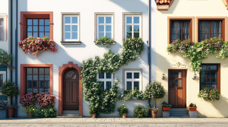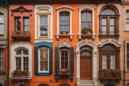 A picturesque European townhouse with elegant windows, no people. Space for text in the surroundings.