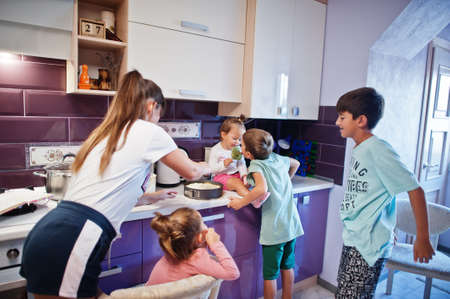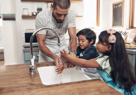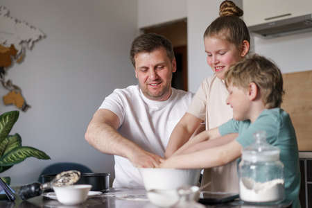 Dad and little daughter and son baking together in kitchen, preparing dough for pie, having fun at home during quarantine