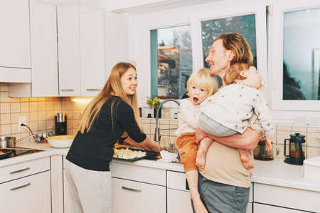 Family life, mother cooking dinner, father holding sleeping baby and excited toddler boy, happy parenthood
