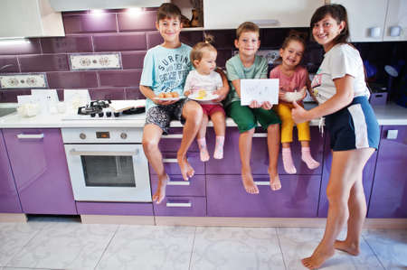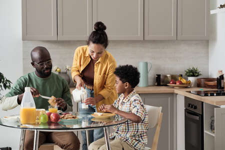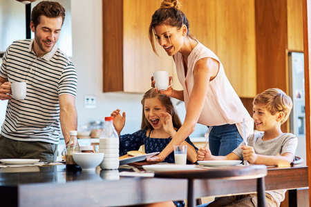 Happy family having breakfast together in the kitchen at home. Mother, father and children having fun together.