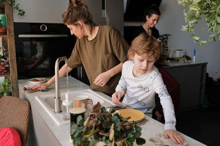 Lesbian family doing housework in kitchen with their adopted little son helping them