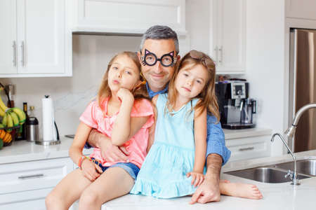Caucasian father dad wearing funny glasses hugging embracing two children daughters looking at camera. People family celebrating fathers day together. Lifestyle authentic real moment.