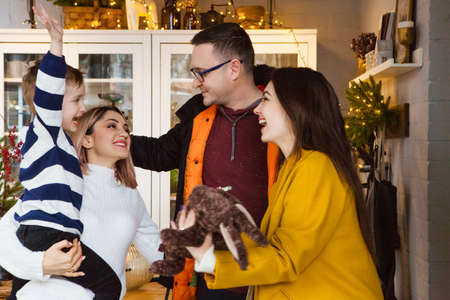 Smiling woman and child welcoming friends with gifts preparing to celebrate holiday together while standing in light modern kitchen decorated in Christmas style