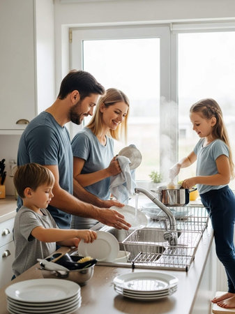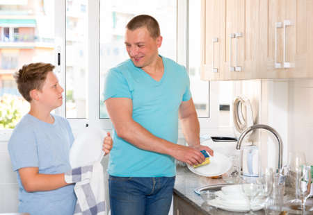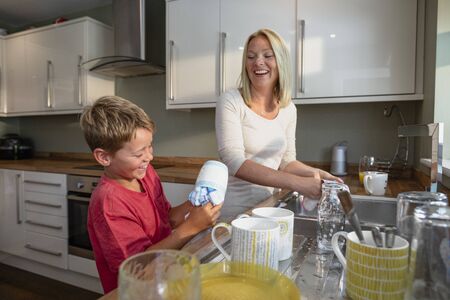 Mother with small daughter washing dishes, winter holiday in private apartment.
