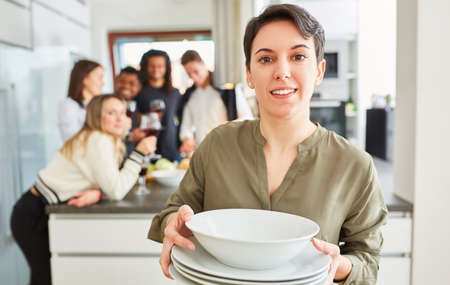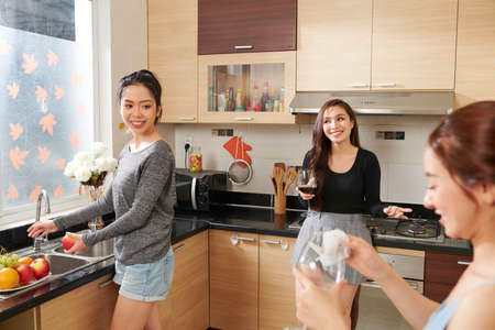 Group of pretty young woman chatting, rinsing fruits and wiping wine glasses when preparing for party