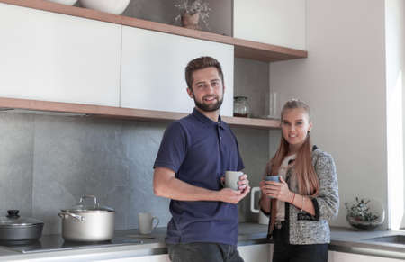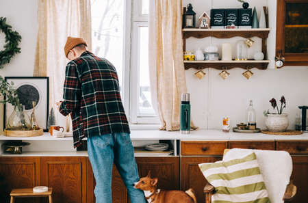 Young caucasian man brewing tea in the kitchen in winter morning.