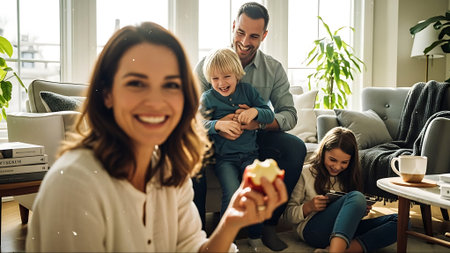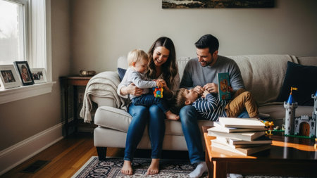 A family of four sits together on a comfortable sofa in a warmly lit room. The composition includes the parents and their two young children. The scene features natural light, soft textures, and a cozy atmosphere. Suitable for illustrating family life, lifestyle, or commercial projects.