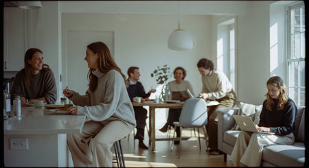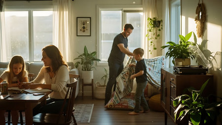 This image showcases a family engaged in various activities within a bright, comfortable home. It features multiple scenes, including reading, cooking, and creative pursuits. The composition highlights a combination of warm colors, natural light, and a relaxed atmosphere. It may be suitable for illustrating family life, lifestyle choices, or educational themes.