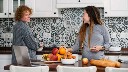 Pregnant woman with dreadlocks and her curly husband in modern kitchen cooking behind. Fresh and healthy food concept.
