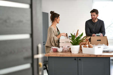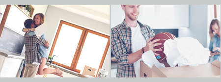 Couple unpacking cardboard boxes in their new home. Young couple.