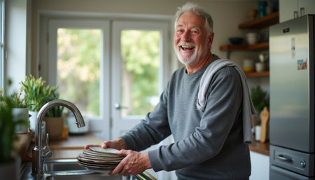 An elderly man with gray hair and a warm smile is happily washing dishes in a sunlit kitchen. The scene radiates joy and domestic bliss, showcasing the simple pleasures of home life and the warmth of family moments.
