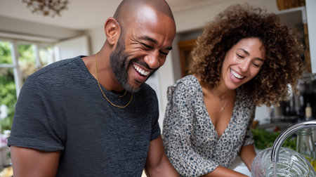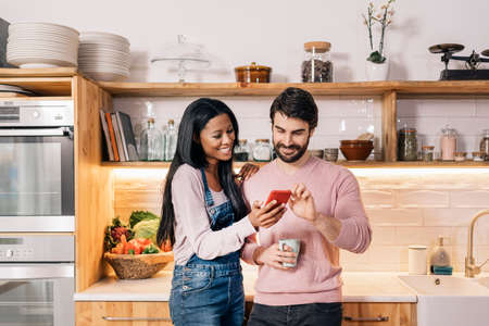 Beautiful black woman showing her boyfriend something in the phone while standing in the kitchen at home.