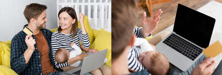 collage happy man holding credit card near wife with infant son and laptop with clank screen