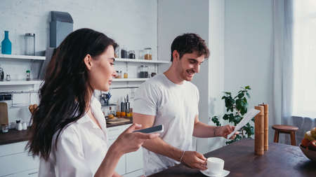 pretty woman holding smartphone near smiling man reading morning newspaper