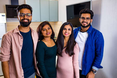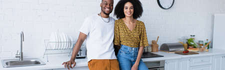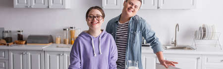 Positive teenagers with down syndrome looking at camera in kitchen, banner