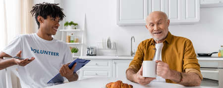 Cheerful african american volunteer holding clipboard near elderly man with cup in kitchen, banner