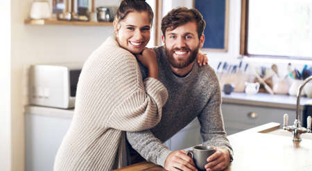 Happy Handsome Young Man in Yellow Jumper and Beautiful Joyful Girl in Jeans Shirt are Posing Together as a Couple. They Sit and Smile in a Sunny Modern Home Kitchen with Healthy Lifestyle Vibes.