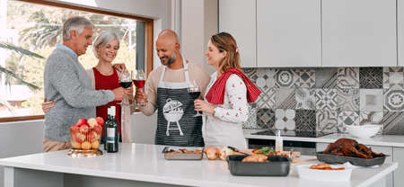 Give your friendship the gift of gratitude. Shot of a group of mature friends toasting with wine while preparing a Thanksgiving meal.