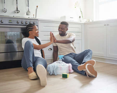 We did it with team work. a young couple giving each other a high five after cleaning up at home.