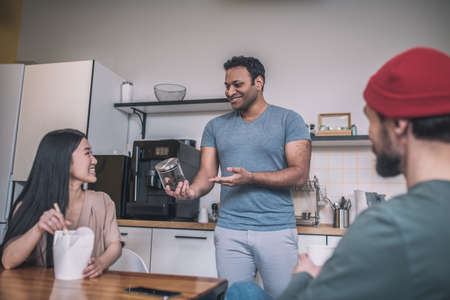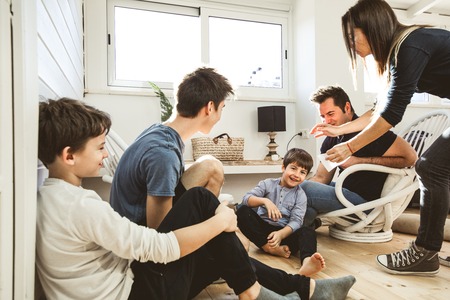Happy family: full body delighted diverse parents playing with son in cozy kitchen on weekend day at home
