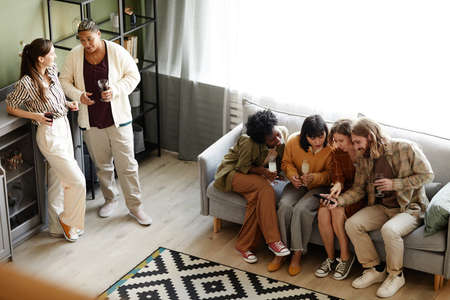 Group of young friends using mobile phone together while sitting on sofa during party in the living room
