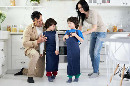 Assistants. Hispanic parents puttting on aprons on two little boys, twins while cooking dinner in the kitchen at home together