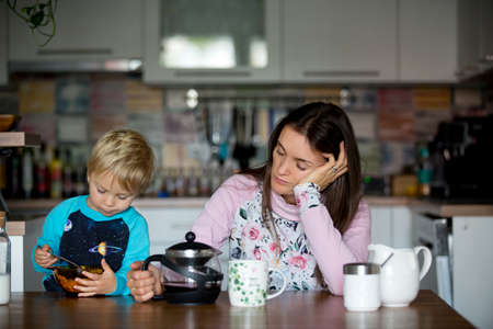 Tired mother, woman drinking coffee in the morning, while child eating breakfast, spilling it