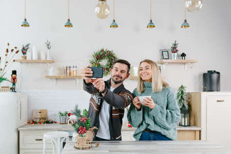 Couple in love husband and wife talk together on video call with friends and family, young family happily celebrates Christmas and New Year breath at home